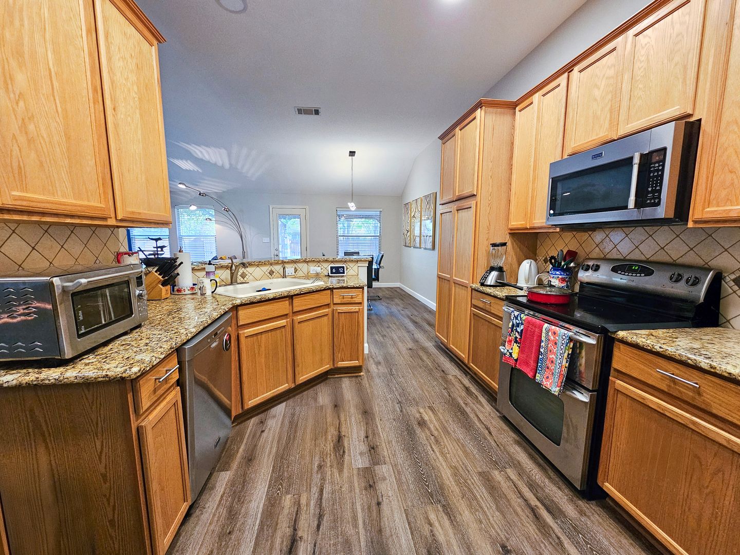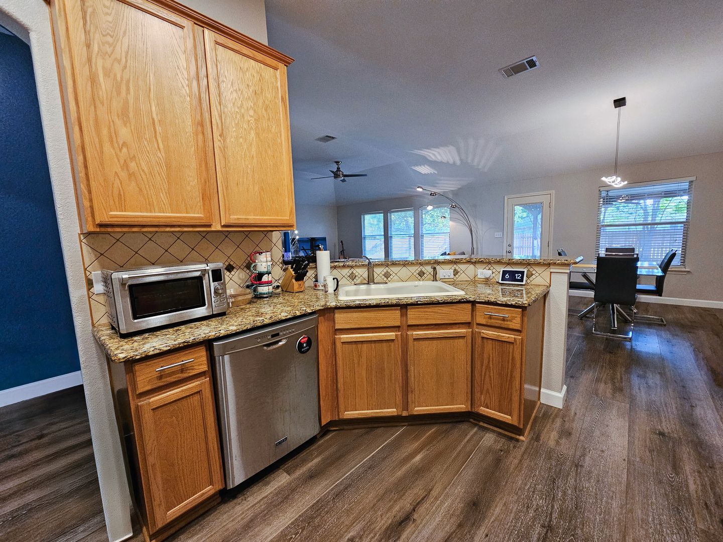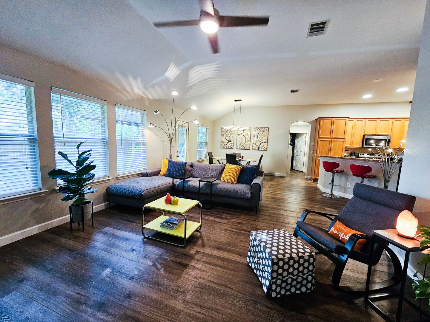 Spacious and thoughtfully designed, this 3-bedroom, 2-bath home offers comfort and convenience at every turn. The split floor plan provides added privacy, with the primary suite tucked away from the other bedrooms. Enjoy the airy, open-concept layout with soaring ceilings, a generous two-car garage that fits large vehicles with ease, and a sprawling backyard complete with a new privacy fence perfect for entertaining, gardening, or simply relaxing.